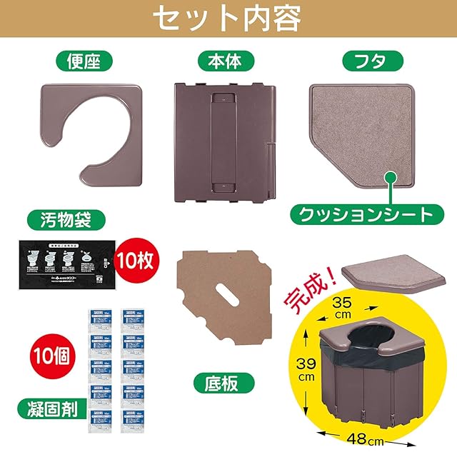 【10回分:目安 1人で2日分相当】本体1個、汚物袋(黒)10袋+凝固剤10個のセット。
