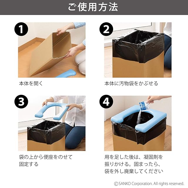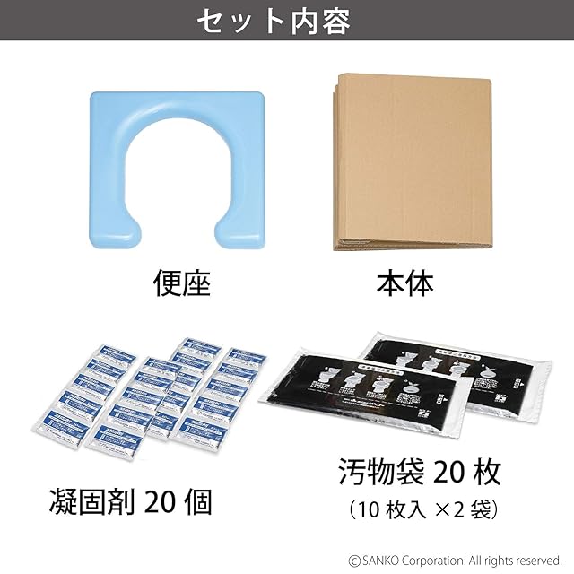 【素材】便座/ポリプロピレン、本体/紙、凝固剤/高分子ポリマー、汚物袋/ポリエチレン