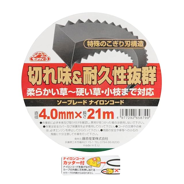 商品名:セフティー3(Safety-3) ソーブレード ナイロンコード 特殊のこぎり刃 直径4.0mm×21m 切れ味&耐久性に優れ、柔らかい草から硬い草・小枝まで対応