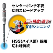 X型(クロス)シンニングで高速穴あけ 抜群のくいつき感。センターポンチ不要で軽い力で穴あけができます(※AMD-3.0以上)