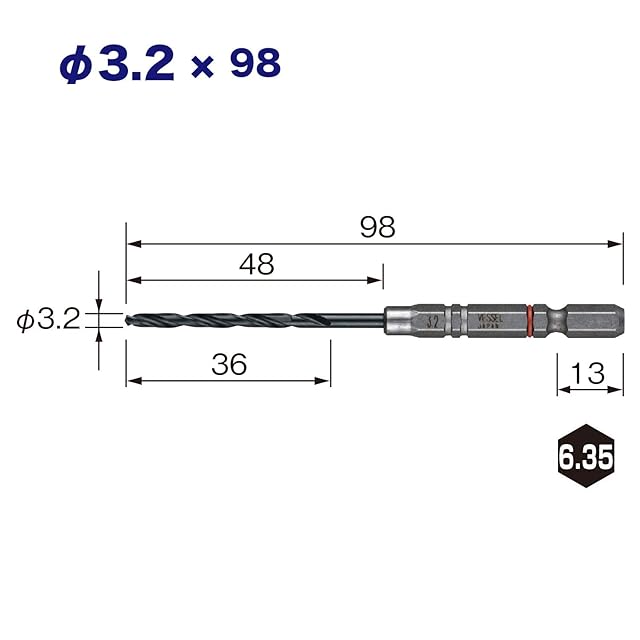 セット内容:φ3.2×98mm…3本 刃先部:高硬度HSS(ハイス鋼)、クロスシンニングで高速穴あけ 本体:特殊鋼 クッションリング:赤 日本製
