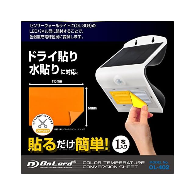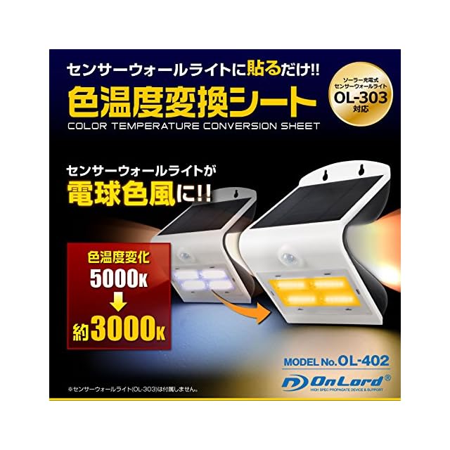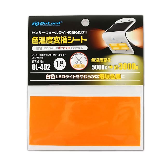 ★センサーウォールライトに貼るだけで白色LEDを電球色風に!★<br /> <br />●ソーラー充電式センサーウォールライト(OL-303)に対応!<br /> ●白色LEDライトのギラつきをおさえ、やわらかな電球色風に変換!<br /> ●色温度が5000K→約3000Kに変化!<br /> ●ドライ貼り・水貼りに対応!はさみで自由にカット可能!<br /> <br />【材質】塩化ビニール樹脂<br /> <br />【サイズ】115×51mm<br /> <br />【カラー】オレンジ<br /> <br />【対応機種】OL-303<br /> <br />【生産国】中国<br /> <br />【JANコード】4573180335676<br /> <br />【注意事項】<br /> ・本製品にセンサーウォールライトは付属しません。<br /> ・用途以外には使用しないでください。<br /> ・本製品使用上の損害に対して、当社では一切の責任を負いかねます。<br /> ・照射測定距離や壁面色および反射角度にもよりますが、貼付することにより、照度が約30%以上減少する場合もございます。予めご了承ください。<br /> ・本製品をハロゲン灯、水銀灯、白熱灯、蛍光灯など、点灯時に高温を発する照明器具に貼りつけたり、光源に直接貼り付けないでください。