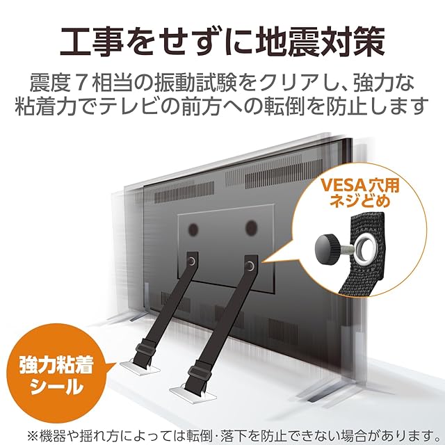 地震対策に。震度7相当の振動試験もクリアした、テレビ裏面のVESA穴を利用した、テレビの前方への転倒を防止する“粘着どめタイプの耐震ベルト"です。