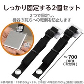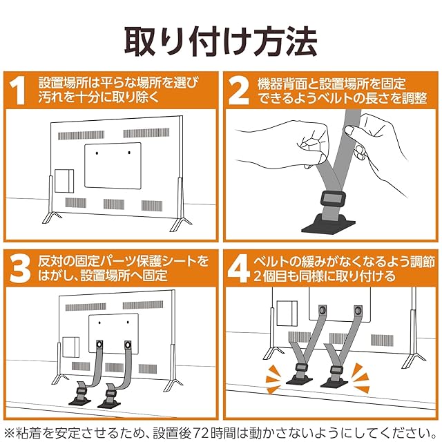 ベルトをテレビ背面のネジ穴に取り付け、ベルトの固定パーツ側を設置場所へ貼り付けることで、前方への転倒を防止します。