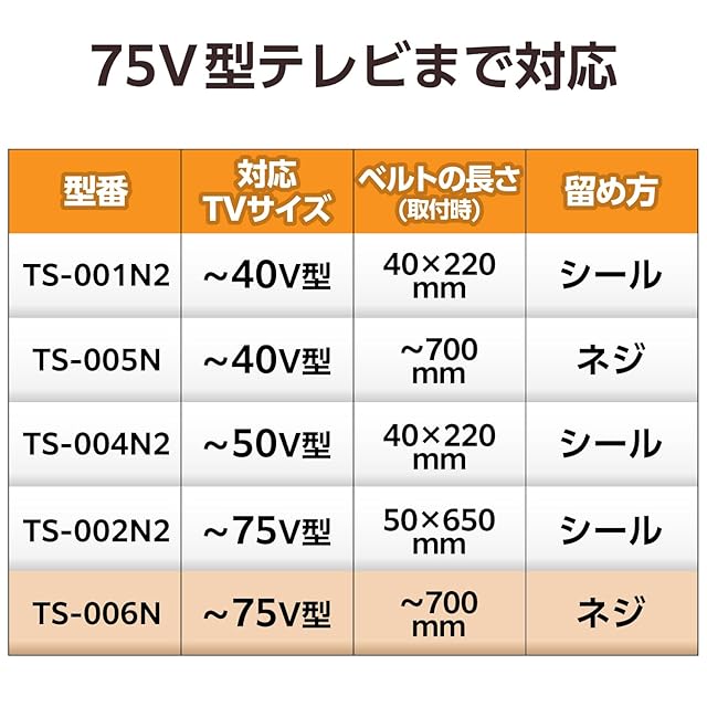 商品名:エレコム 耐震ベルト テレビ用 75インチまで対応 ネジどめタイプ TS-006N