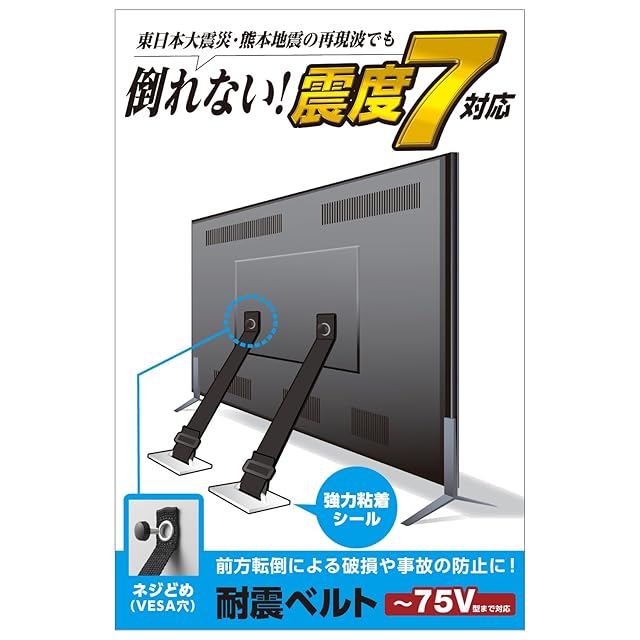 地震対策に。震度7相当の振動試験もクリアした、テレビ裏面のVESA穴を利用した、テレビの前方への転倒を防止する“ネジどめタイプの耐震ベルト"