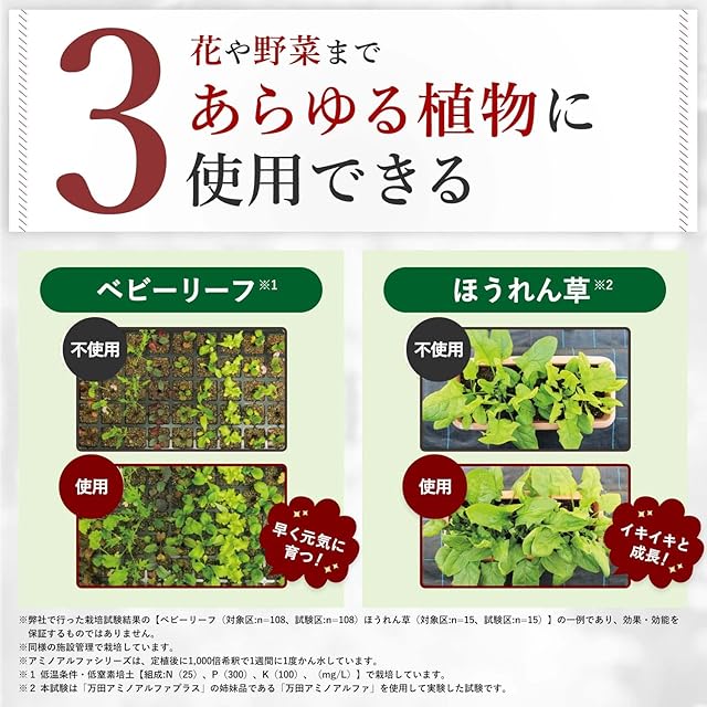 ※万田アミノアルファプラスは肥料成分を含みますが、含有量が少ないため通常の肥培管理を行ってください。