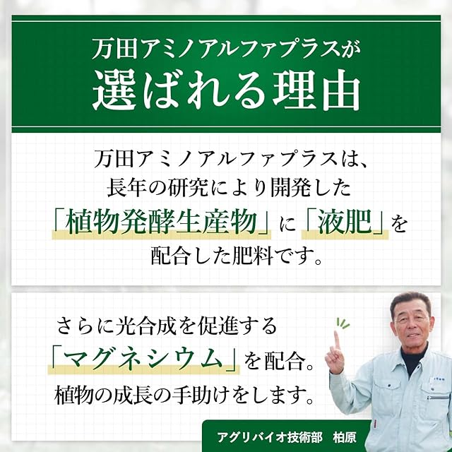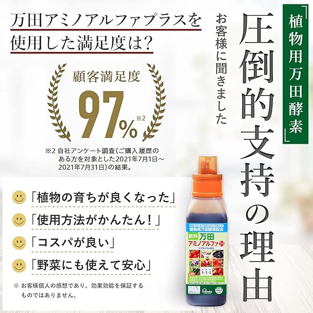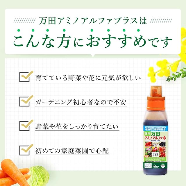 万田アミノアルファプラスは、果実類、根菜類、穀類、海藻類など数十種類の植物性原材料を使用し、3年以上発酵・熟成させた植物用発酵生産物に、有機質を主体とした液肥を配合した肥料です。 さらに光合成促進を目的として「マグネシウム」を配合しました。 【内容量】500ml 【使用方法】水で1,000倍に薄めてジョウロや噴霧器などで植物に、1週間から10日おきに与えます。 ジョウロでは、根元にかん水したり、植物の上からシャワー状にしてかけます。 また噴霧器で霧状にして、植物全体に散布します。 (水10リットルのバケツに付属カップ1杯10mlが目安) ※希釈した液は、長期保存できません。できるだけその日の内に使い切るようにしてください。 また、希釈する場合の水は、水道水などきれいな水を使用してください。 【こんな時に使えます】 植物を育て始めるとき 開花前後 植物に元気がないとき 葉や実が成長するとき 花や実がたくさんついているとき
