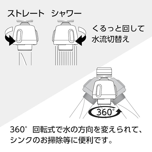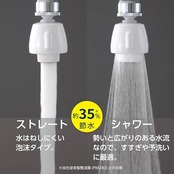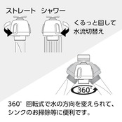 【くるっと回して流水切替】本体を90度回す毎にストレートとシャワーの切替えができます。シャワーはすすぎや、食器洗い機の予備洗いに適しています。ストレート水流は水ハネしにくい泡沫吐水です。