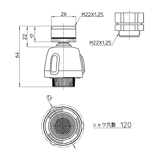 【取付けできるパイプ】泡沫器の付いたタイプ(M22X1.25)、先端のふくらんだ丸形タイプ(16mmの自在吐水口用)に取付けできます。※万能パイプには取付不可。角型や特殊な吐水口には取付けできません。