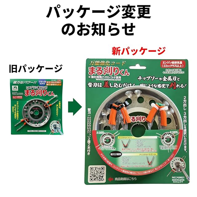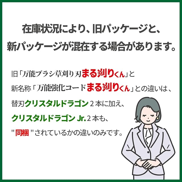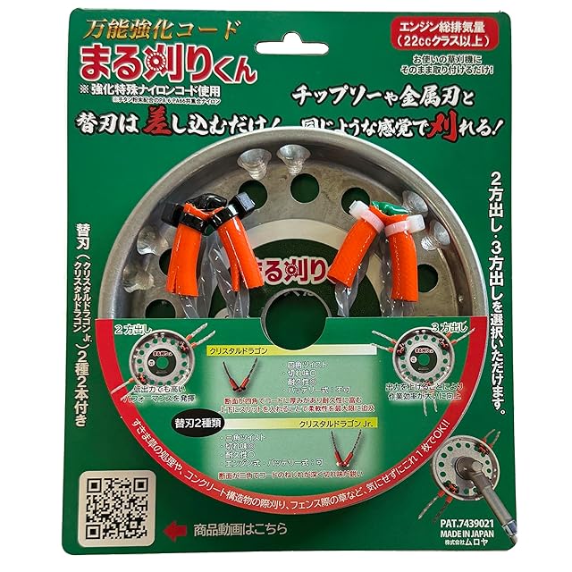 【特徴1】本体はアルミ合金により、軽量で劣化しにくく、半永久的にご使用いただけます。次回からは替刃(別売り)で対応可能です。</br> 【特徴2】プロ用強化特殊ナイロンコード(ツイスト)を使用しているため、金属刃に近い驚異的な刈り心地を実現。一般草はもちろん、コンクリートなどの際刈りにも、大いに力を発揮します。</br> 【特徴3】強化されたプロ用特殊ナイロンコードによりナイロンコード刃自体が飛散してしまうストレスを軽減 。6ヶ所の差し込み口があり、用途に応じて2方出し、3方出しを選択可能です。(ワンタッチでお取り付けいただけます)</br> 【特徴4】ブラシ刃自体が全面刃になっており、ブラシの先端で2本のブラシの刃が重なることにより</br>草を捉えた瞬間ブラシはもちつもたれつの関係になり、当たり負けして逃げることなく、 ダブルカットに草を刈ることになるため、より強力なパワーが生まれ、大型で繊維質の強い草も十分刈り取ることができます。</br>【特徴5】草を刈ることでブラシの先端部が、土面やコンクリート構造物や石等に擦れることにより、自然に研げた状態が持続するため、切れ味がほとんど落ちることなく草刈りができます。</br>【特徴6】草を刈ることでブラシがだんだん減耗していくが、ブラシの根元は本来の強度を維持されるため、切れ味はだんだん鋭くなります。</br>【特徴7】ブラシの刃が刈り取った草を左側の外向きに飛ばしてくれるため、 刈り取った草が作業機に巻きつくことが少なく、スムーズに草を刈り取ることができます。</br>【特徴8】ブラシの刃が固定されているため、水の中の草も水の抵抗に負けることなく刈り取りが可能です。(水切りカットOK)</br>【特徴9】ブラシ刃自体の長さが左右異なるため、取り付け方法によって、抜けの良さの実感。回転2枚刃を実感。のようなカスタムが可能です。</br> 【特徴10】ブラシ刃が10°程度下向きに出るように設計されているため、草にヒットしやすく、石跳ねが多い場所では本体を逆(ラベルが貼付されている面を下)に装着することで、石跳ねを軽減することができます。</br>【仕様 】替刃 クリスタルドラゴン 2本・クリスタルドラゴンJr. 2本付き</br>【対象】ハンドル付、動力式エンジン付き草刈り機、総排気量22cc以上。