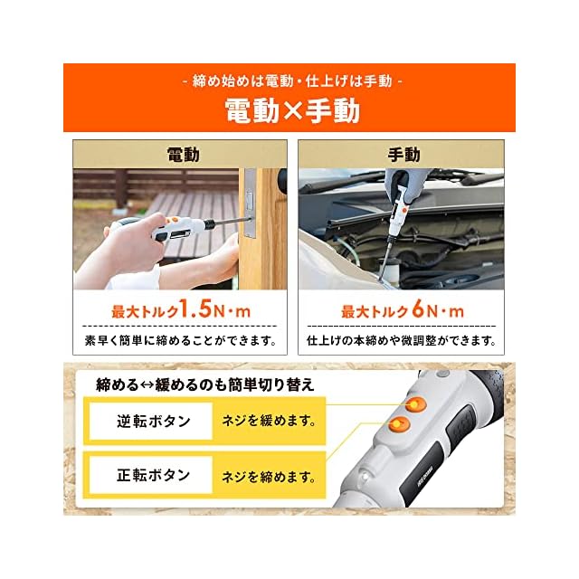 無負荷回転数:260rpm / 無負荷連続動作時間:約120分 / トルク(N・m):[電動]1.5[手動]6 / 適用ビット:6角軸(2面幅6.35mm)両頭・片頭ビット対応
