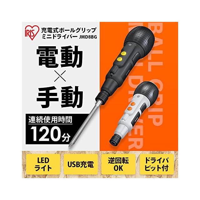 商品名:アイリスオーヤマ ボールグリップドライバー 3.6V グレー 電動ドライバー ペン型 小型 手動兼用 ビット1本付 充電ケーブル付 JMD8BG-H 軽量 家具組み立て