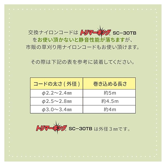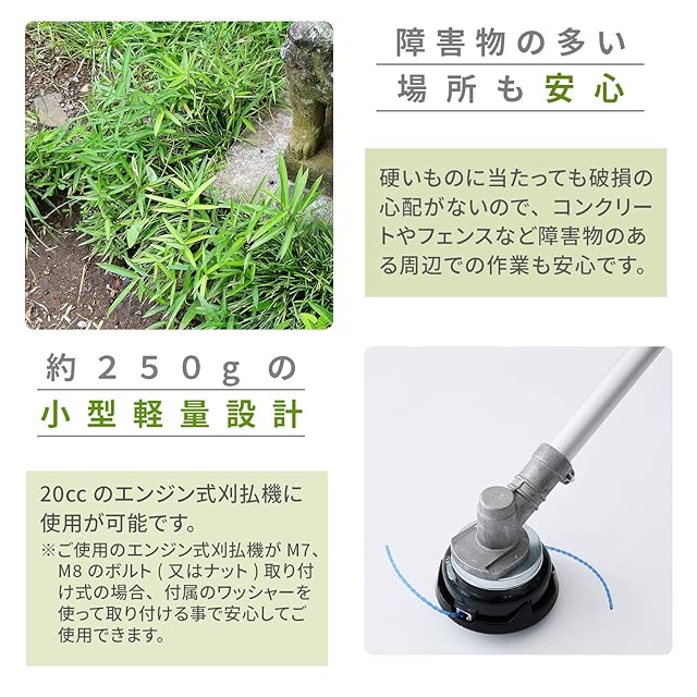 【特徴】国内ほぼ全てのエンジン式刈払機に使用可能なナイロンカッターです。(※一部使用できない機種があります) 連続作業ができる全自動式なので、作業中ナイロンコードが短くなると遠心力で自動的に繰り出されます。またエンジンの性能に合わせて長さが自動的に調整され最適な長さで作業ができます。硬いものに当たっても破損の心配がないので、コンクリートやフェンスなどの障害物のある周辺での作業も出来て便利です。