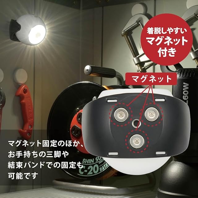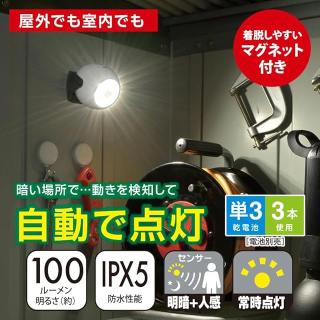 【 特 長 】 ◆周囲が暗くなり、人を検知すると点灯します。離れてしばらくすると自動消灯します。 ◆屋外でもご使用いただける防噴流形(IPX5) ◆乾電池式で配線不要。電源のとれない場所や配線ができない場所におすすめです。 ◆マグネット固定のほか、お手持ちの三脚や結束バンドでの固定も可能です。