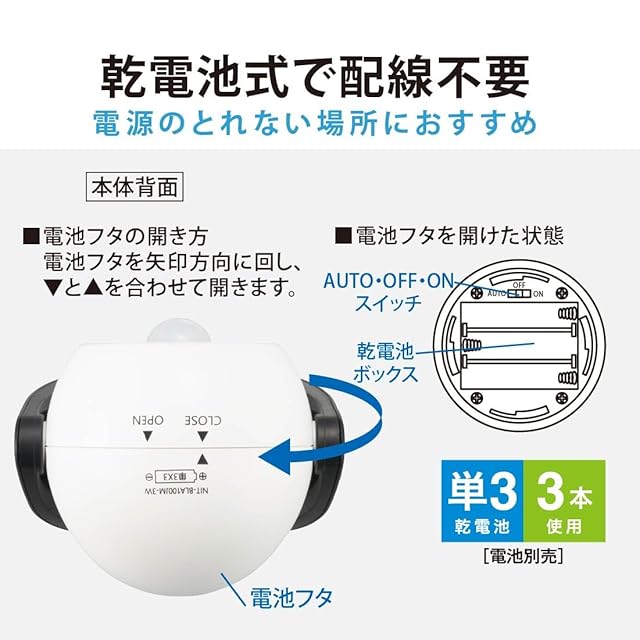 【 仕 様 】 ◆光源:LED×6個(交換不可)/昼白色 ◆全光束:約100ルーメン ◆人感センサー検知範囲:約5m 上下約90° ◆点灯保持時間:約10秒 ◆スイッチ切替機能:AUTO/OFF/ON ◆電源:単3形乾電池×3本(乾電池別売)