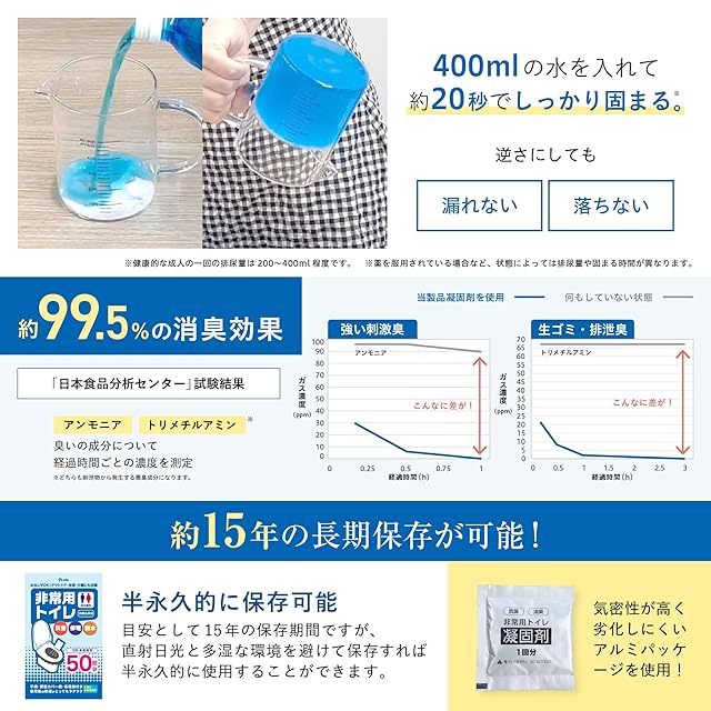 ✅【15年保管 抗菌・消臭凝固剤 しっかり固まる】簡易トイレの吸水性凝固剤は除菌性があり、菌の増加による嫌な匂いの増加を抑えることができます。消臭凝固剤のため、化学物質としてのアンモニアや硫化水素だけでなく、糞尿に多く含まれるメチルメルカプタンにも有効です。凝固剤は400mlの水分をしっかりと固めてトイレのあとに廃棄しやすくします。