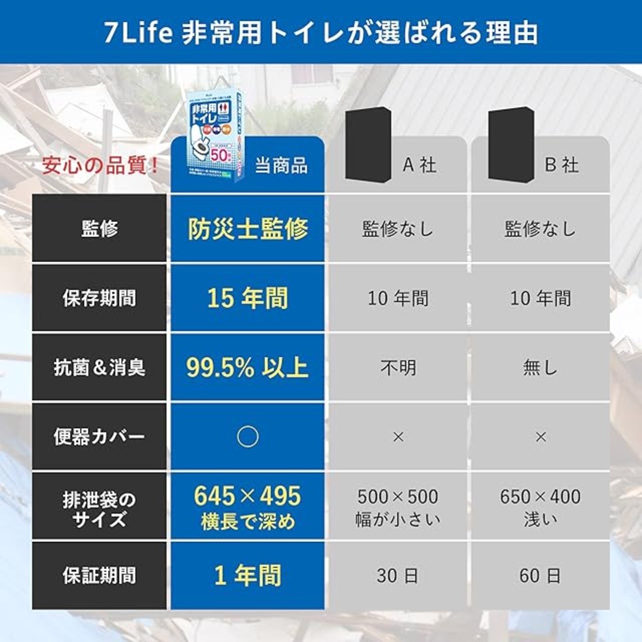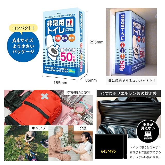 ✅【コンパクトサイズで収納簡単!】非常用・災害備蓄品・アウトドア用としても人気の簡易トイレ。A4サイズより小さくで コンパクト!省スペース設計(縦295mm×横185㎜)で備蓄に場所をとらず、箱のまま本棚やトイレ棚に保管や、ご家庭または企業や自治体の方にも最適です。車内用として持ち運び携帯もできる最適なサイズです。防災士が監修した防災セット! 災害用トイレとしてだけでなく、携帯トイレとして、介護の場面や、また足が不自由な方にもお使い頂ける簡易トイレです。トイレに被せるだけの簡単取付なので、お子さまやご年配の方まで、ストレスなくお使い頂けます。災害時などの緊急用トイレやキャンプ用の携帯トイレとしても幅広くご利用いただける災害用トイレです。7Life ブランド認証商品