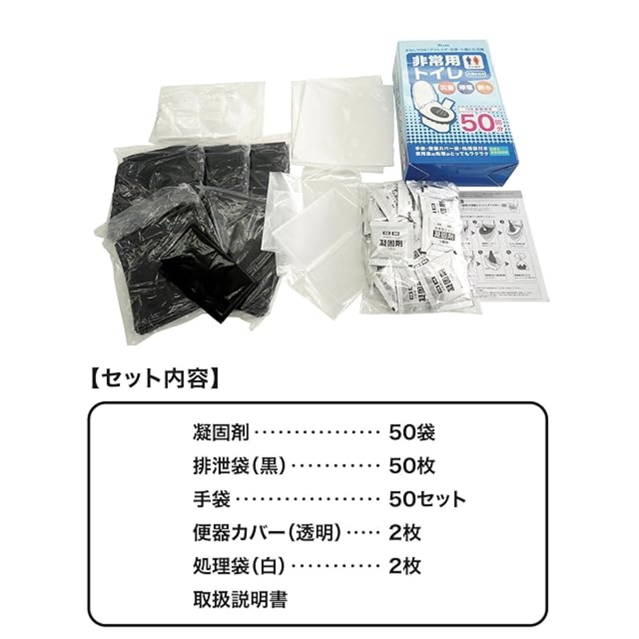 ✅【セット内容】◆凝固剤×50回分、◆黒色ポリエチレンビニール袋 50枚、◆ポリエチレンビニール手袋 X100枚 (50組)、◆便座カバー(透明)×2枚、◆防臭処理袋×2枚