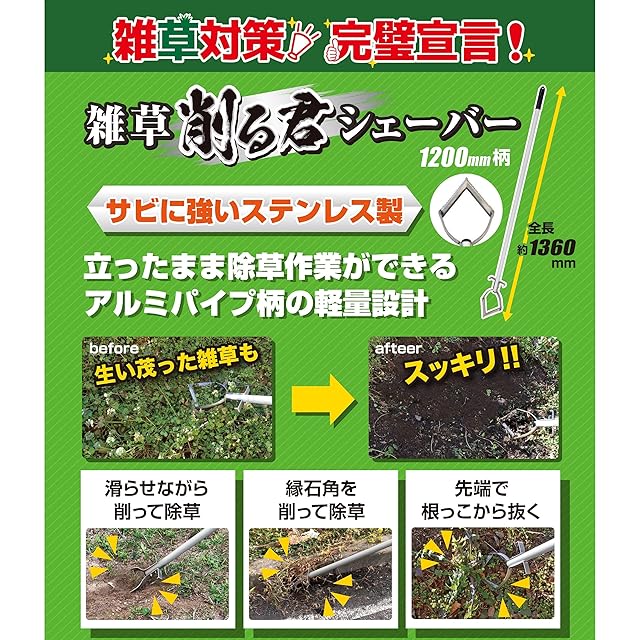 商品名:DAISHIN 雑草削る君シェーバー 1200mm柄 草取り 道具 立ったまま 草刈りレーキ 草刈 庭 の クサカリ 草刈り 際刈り 軽量 草取り器 長柄 お手軽 鎌 農具 草削り 草むしり 対策 便利 雑草対策 らくらく 除草 カマ 農業 女性 軽い 安全 畑 あぜ 道 公園 すきま
