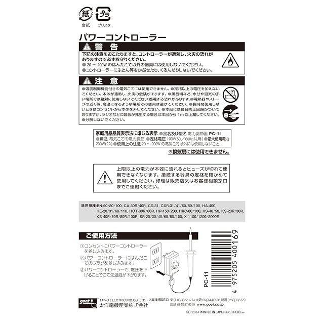 太洋電機産業(goot) パワーコントローラー PC-11 電気はんだごて用 【こて先の温度調整】【樹脂加工品の切断】【レザークラフトの焼印など】 20~200W 電圧調整器 スピードコントローラー 日本製 | emishop315