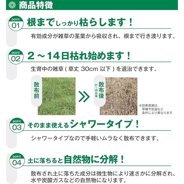 有効成分が雑草の茎葉から吸収され、根まで行き渡り枯れムラが少ない除草剤です。