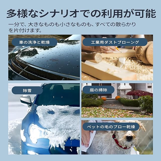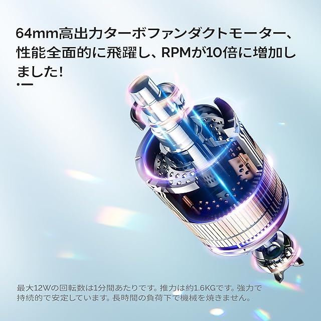 強力ブロワー: この電動ブロワーは、64mmのターボファンエンジンによって駆動されています、最大回転数は120000RPM、最強推力は約1600g、洗車後に車を素早く乾かすのに非常に適しており、タオルで拭く手間が省けます、また、除雪、落ち葉や水たまりの掃除などの作業も簡単に行うことができます