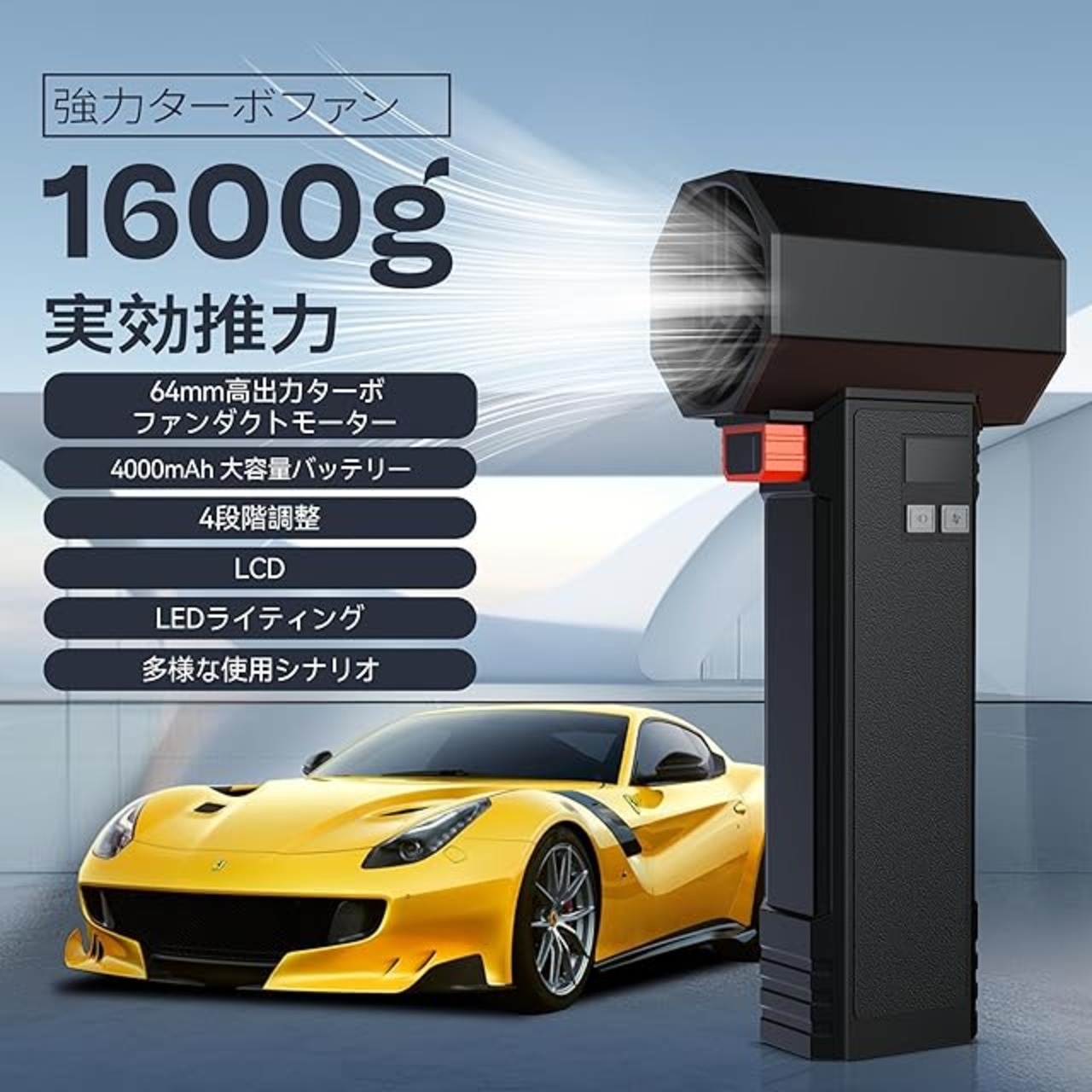 4段階風速調節: 風量は利用シーンに合わせてお好みの強さに調整出来る4段階調整可能の強力ブロワー、1段目は推力160g、2段目は推力350g、3段目は推力760g、Turbo段目は推力1600g(ターボモードを開始するには、風速ボタンを長押しして開き、離すと閉じます)。