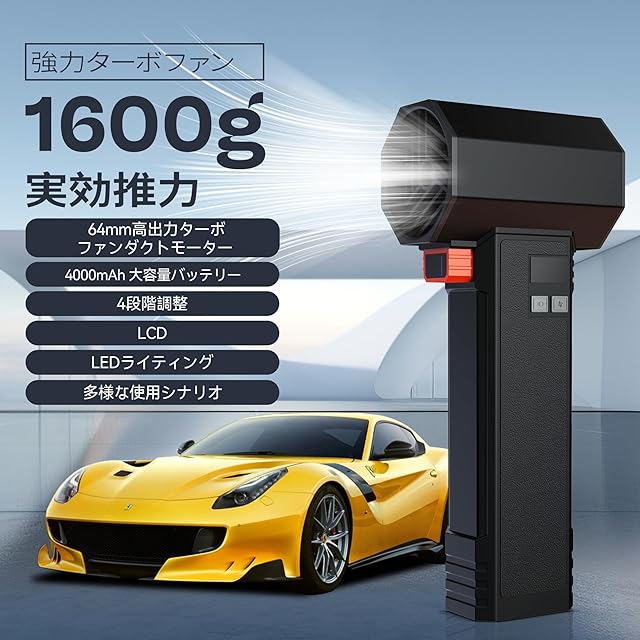 Xooponの車用ターボジェットファンは見た目も美しく、使いやすく、価格もお手頃です。車の表面の水を素早く吹き飛ばし、タオルでの手間がかかる作業から解放されます!パワフルな風速で、洗車や除雪、落ち葉の吹き飛ばしにも簡単に対応します。<br> <br>説明: <br>パワフルな性能: 洗車後の車の素早い乾燥に最適で、タオルでの手間を省く。また、除雪や落ち葉、水の払い落としにも利用可能。高性能の64mmターボファンダクテッドモーターで、最大120,000回転/分のスピードと約1.6キログラムの推力を生成する。<br> <br>マルチユース&LEDライト: LEDライトが付いており、暗い場所でも掃除が容易。コンピュータのキーボード、ラップトップ、カメラ、車のシート、ブラインドなど多岐にわたる清掃に対応。また、ベッドや救命ボートの膨張にも使用可能。ピクニックや火起こし、床掃除、ペットの毛の除去にも有用。<br> <br>充電式コードレスエアーダスター: 高容量の4000mAhバッテリーで最大80分間連続稼働。圧縮空気ボンベとは異なり、再充電して何度も使用可能で、清掃中に液体や氷が生成することがない。<br> <br>4段階の速度コントロール: 最大速度の20%、50%、100%、130%の4段階の速度調整が可能。異なる使用シーンに応じた適切な風量を提供し、貴重品を安全に保護する。<br> <br>高品質素材: 高硬度で耐高温性の材料を使用。完璧な質感、強力な爆風力、低発熱性を備え、軽量で持ち運びやすく、握りやすい設計。より便利で長持ちするユーザーエクスペリエンスを提供する。<br> <br>製品仕様: <br>製品モデル:TF64 <br>バッテリー容量:5000mAh/16.8V <br>定格電圧:16.8V <br>本体サイズ:27011072mm <br>充電時間:約3時間<br> <br>使用説明: <br>➊ 低速:底部の電源ボタンをオンにしてから、風速ボタンを押して低速モードに入ります。 <br>➋ 中速:風速ボタンを1回クリックして、中速モードに切り替えます。 <br>➌ 強風:再度風速ボタンをクリックして、強風モードに切り替えます。 <br>➍Turbo Mode:風速ボタンを長押しして開き、離すと閉じます。(詳細は付属の取扱説明書をご覧ください)。<br> <br>パッケージ: 本体、充電器、説明書<br> <br>附注: <br>1:ファンの推力は手動で測定されており、誤差が10gから20g発生することがありますが、これは正常です。 <br>2:異なるディスプレイ間の違いにより、画像が製品の実際の色と異なる場合があります。 <br>3:パッケージには上記の内容のみが含まれており、他の製品は含まれていません。 <br>もし他にご要望がございましたら、お知らせください。お客様のご要望に最善を尽くします。