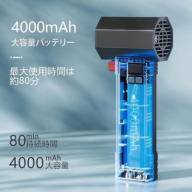 充電式ブロワー: このターボジェットファンは、4000mAhのバッテリーを搭載しており、急速充電で3時間にフル充電できます、低速モードで最大80分間使用可能です