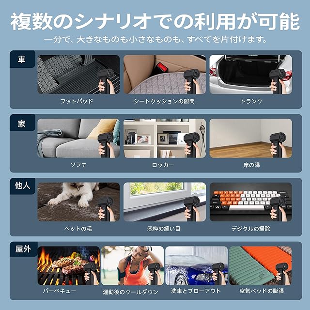 高品質素材:このワイヤレスエアダスター、高硬度で耐高温の素材で作られており、質感が完璧で、爆発力が強く、発熱量が少なく、軽量、小型で持ち運びが便利です、ブロワーの握り心地も快適です、より便利で持続可能なユーザーエクスペリエンスを確保します