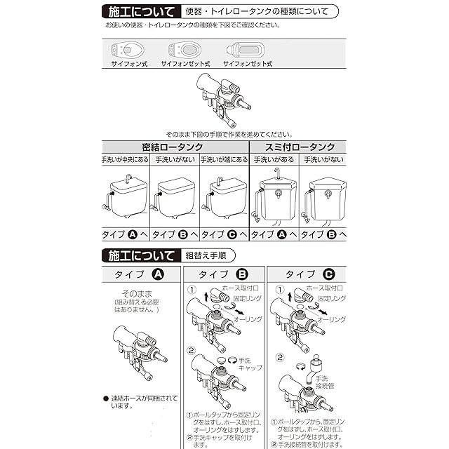 部品を組替えることにより、手洗付、平付、手洗なしのロータンクに使用できます。