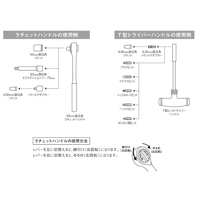 セット内容:9.5mm差込角ラチェットハンドル・コンビネーションレンチ(8・10・12・13・14mm)