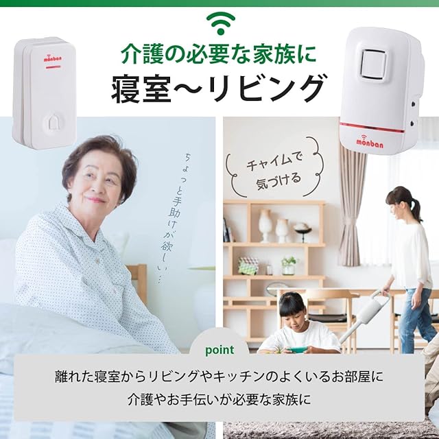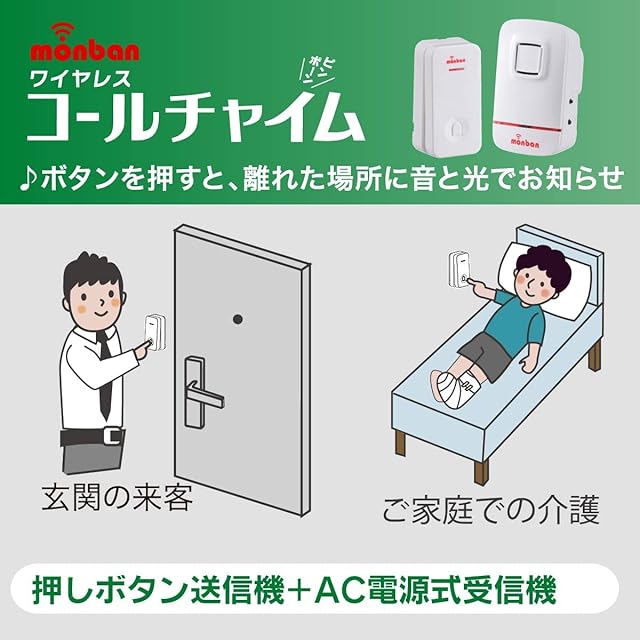 AC電源式受信機、 外形寸法:幅58×高さ98×奥行53mm(電源プラグを含む)、 質量(約):76g、 動作距離(約):80m(直線見通し・遮蔽物の無い環境)、 設置場所:室内、 呼び出し音:32種類、 電源:AC100V 50/60Hz 2W、 音量:最大 85dB(4段階音量調整)