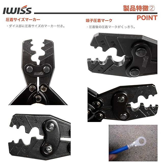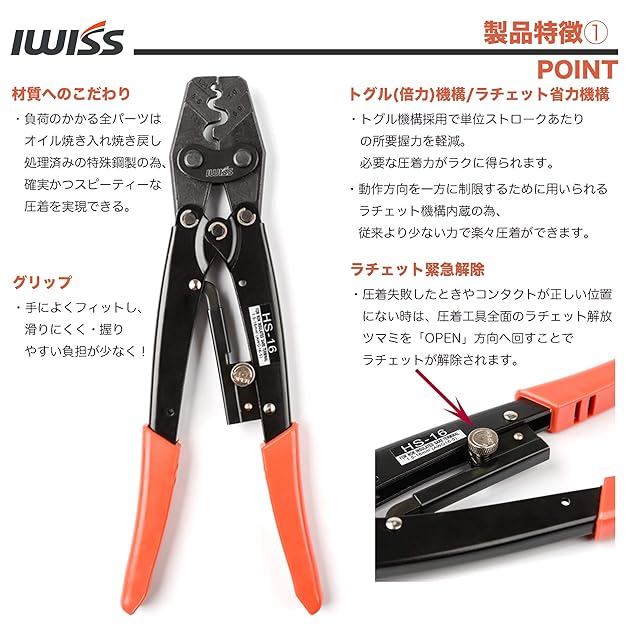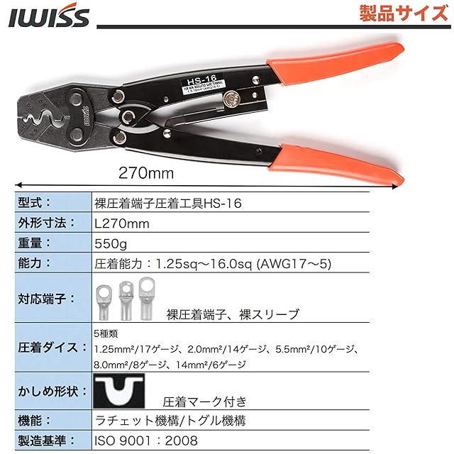 商品名:アイウィス(IWISS) 裸圧着端子 裸圧着スリーブ 圧着工具 汎用タイプ 1.25-16.0sq対応 HS-16