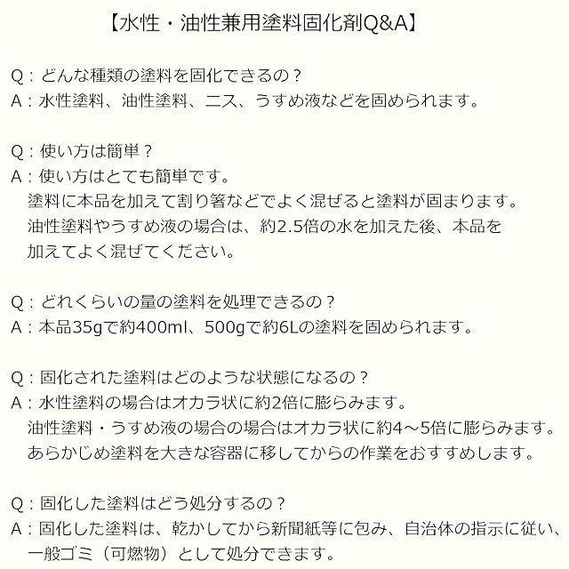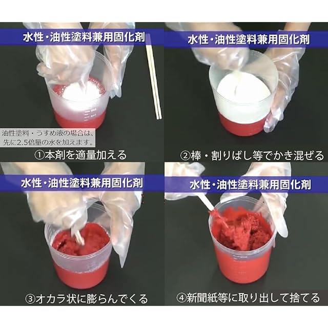 残った水性塗料や油性塗料に混ぜるだけで簡単に固化できます。