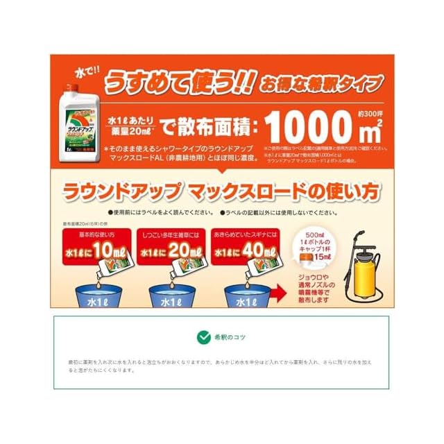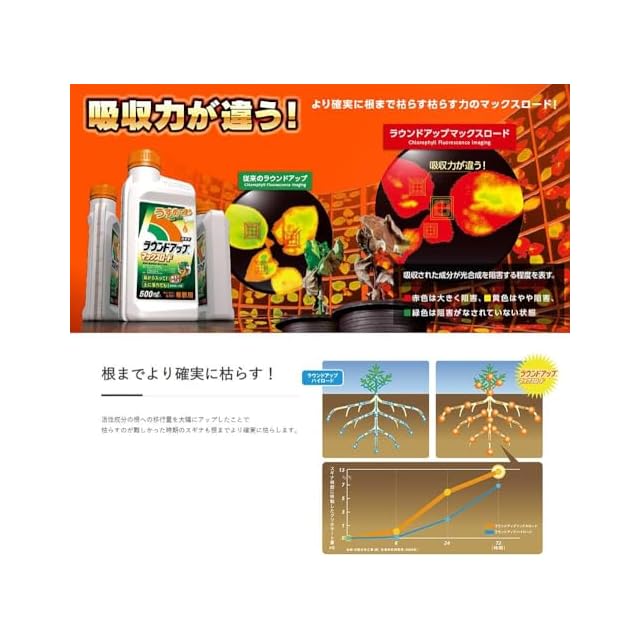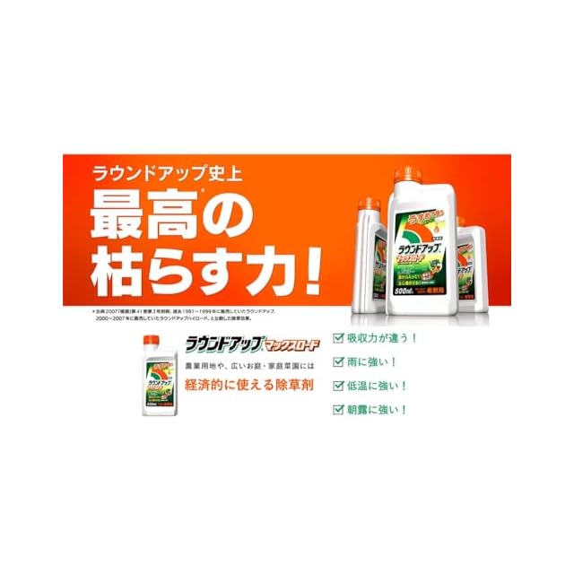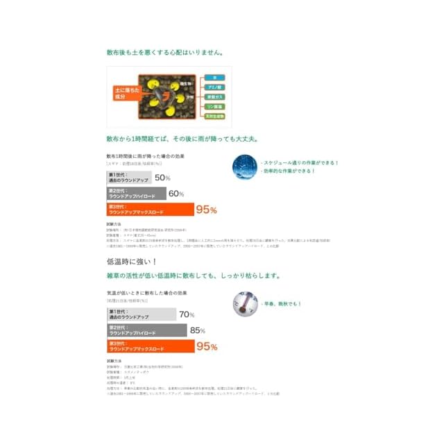 散布から1時間経てば、その後に雨が降っても大丈夫。 低温に強い! 雑草の活性が低い低温時に散布しても、しっかり枯らします。 朝露にも強い! 朝露が付いた状態の雑草に散布しても、確かな効果を発揮します。