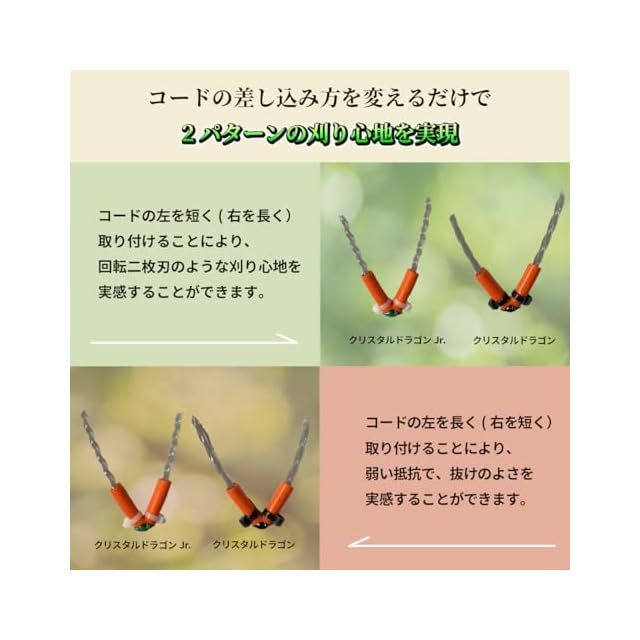 ●独自のプロ用強化特殊ナイロンコード(ツイスト)を使用。金属刃に近い刈り心地を実現