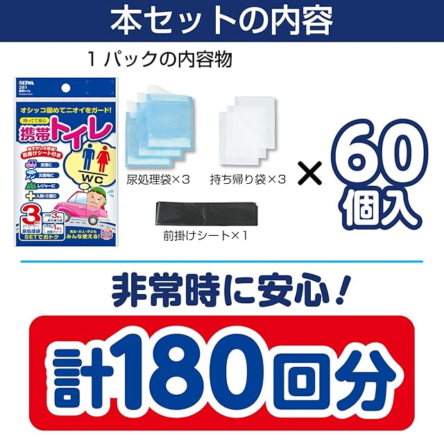 商品名:セイワ(SEIWA) 常備用品 携帯トイレ 3枚入×60個セット 計180回分 IMP293 前掛けシート付き 600cc 防災 災害 非常用 高速 携帯 簡易 緊急 車中泊 ロングドライブ トイレ