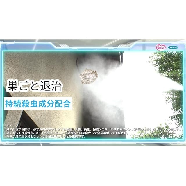 ハチ駆除エアゾール 適用害虫:スズメバチ(ツマアカスズメバチ含む)、アシナガバチ、クマバチ(タイワンタケクマバチ含む)、ミツバチ、アブ、クモ、ガ、ムカデ、ヤスデ、ゲジ、ケムシ、カメムシ