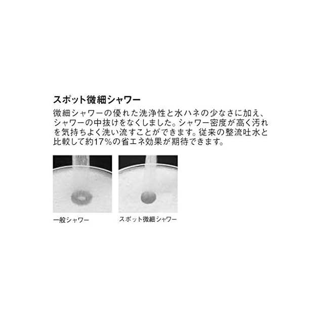 【水ハネを低減するスポット微細シャワー】密度の高いシャワーで水ハネを大幅に低減。お皿洗い時の水の飛び散り防止につながります。また吐水口部で整流とシャワーの切替が可能です。