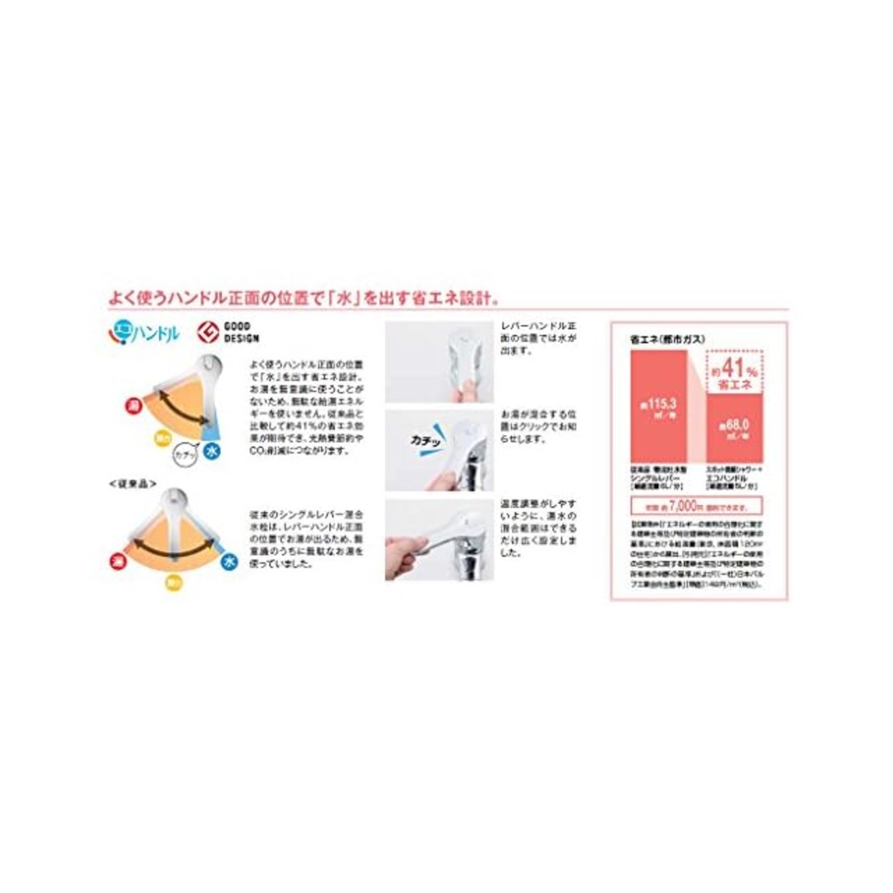 【省エネ設計のエコハンドル】お湯が混合する位置になるとクリックでお知らせ。無駄な給湯エネルギーを使わず、光熱費節約やCO2削減につながります。お湯の温度や流量の調節はレバーひとつで簡単です。