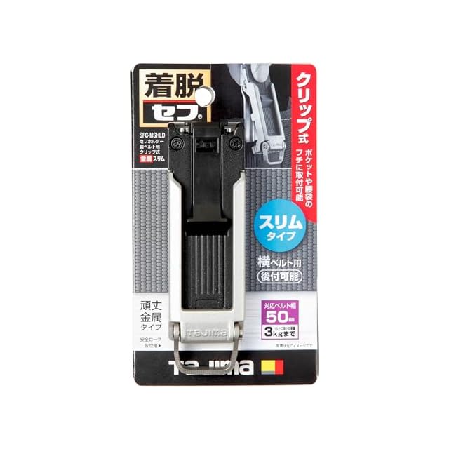 タジマ セフシステム セフホルダー胴ベルト用 クリップ式 金属 スリム SFC-MSHLD 取付場所に悩まないスリムタイプ 腰周りの左右にとらわれないトップボタン方式 作業着のポケットや腰袋のフチにも取付可能 安全ロープ取付環付 セフが不意に外れにくいロック機構付 強度重視の金属タイプ | emishop315