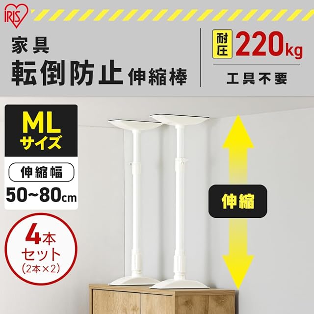 【4本セット】 アイリスオーヤマ 転倒防止 突っ張り棒 転倒防止棒 転倒防止器具 転倒防止用突っ張り棒 転倒防止 家具転倒防止伸縮棒MLサイズ ホワイト KTB-50R 突っ張り棒 強力 伸縮棒 防災用品 転倒防止棒 防災グッズ 地震対策 耐圧約220kg MLサイズ