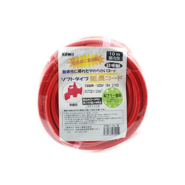 商品名:宏和工業 kowa ソフトタイプ 延長コード 15A・10m 3ツ口 レッド KM01-10 日本製