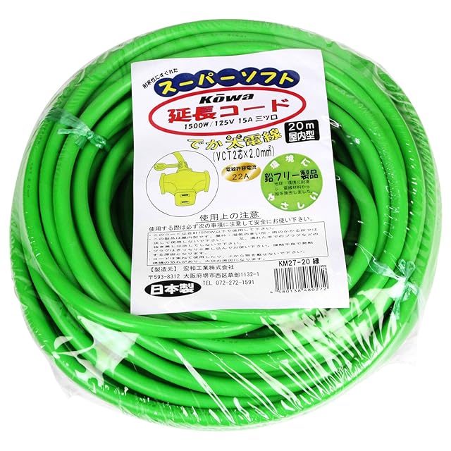 商品名:宏和工業 kowa スーパーソフト 延長コード デカ太電線 15A・20m 3ツ口 ミドリ KM27-20 日本製