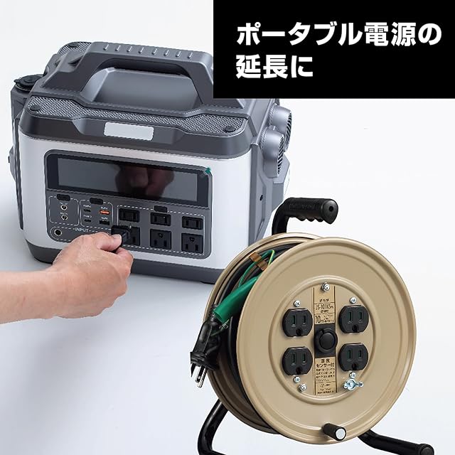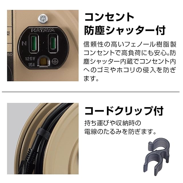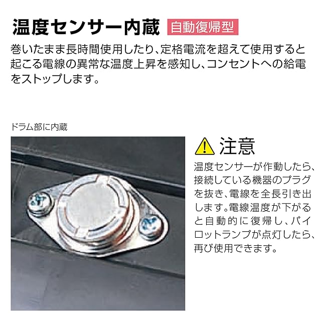 【特徴】コンパクトなボディにプロ用キャブタイヤケーブルを採用した、軽作業や手狭な現場用の本格派小型リール(10m)。業務用としてはもちろんご家庭でも使用可能。プラグはアースピンのスライドにより2P/2P接地付コンセントのどちらにでも接続できる「フキュートビプラグ」を採用。電線の溶解・焼損事故を防ぐ温度センサー付(自動復帰型)。コンセント防塵シャッター付でコンセント内部へのごみやホコリの侵入を防止。