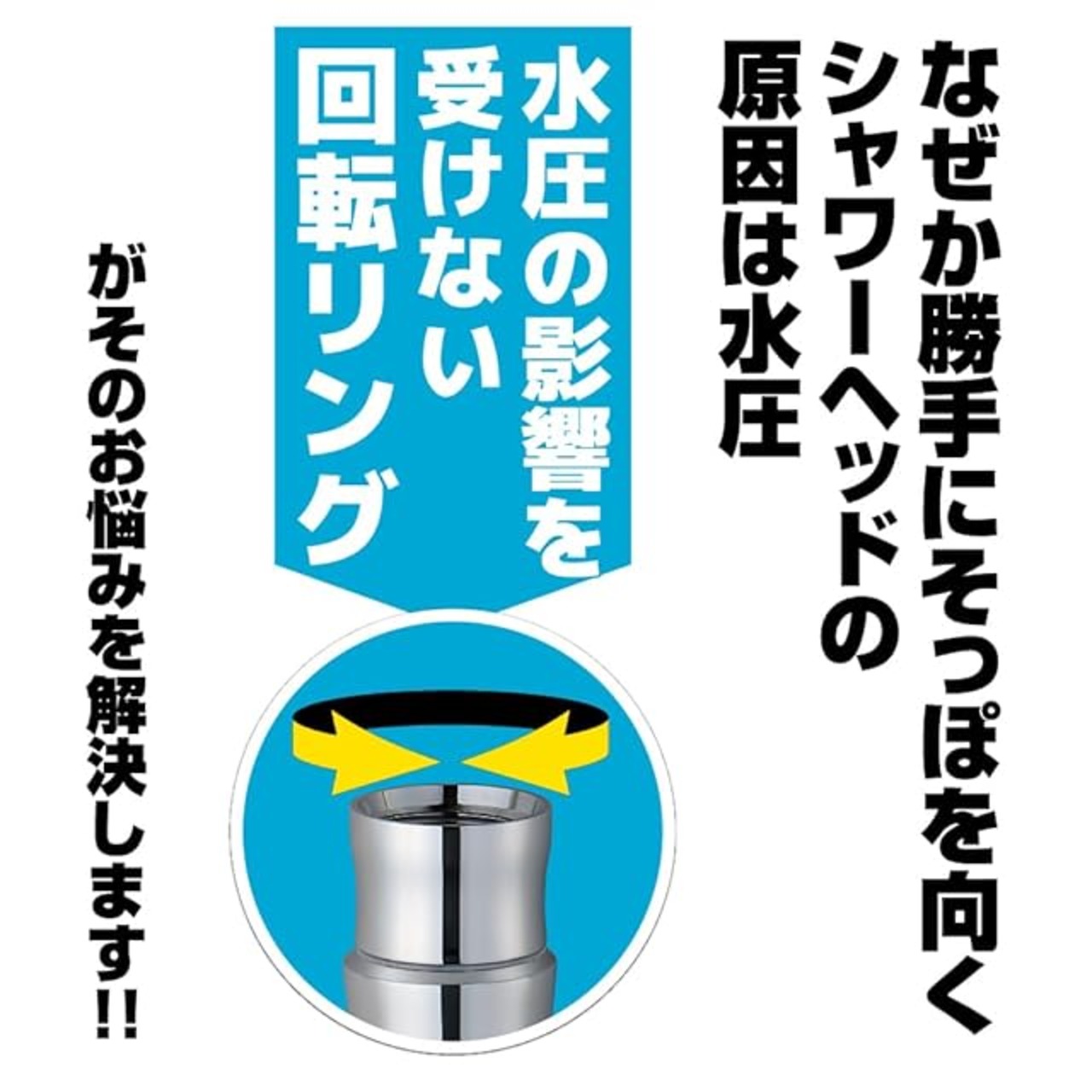 【お風呂の小さなイライラを解消! 】水圧の影響を受けない回転リングによって、勝手にそっぽを向くシャワーヘッドが思い通りの方向にピタッと止まります。