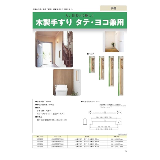商品名:ハイロジック TQOOL 安全・安心 屋内用 木製手すり タテ・ヨコ兼用 600mm 32パイ 耐荷重:80Kg 97254