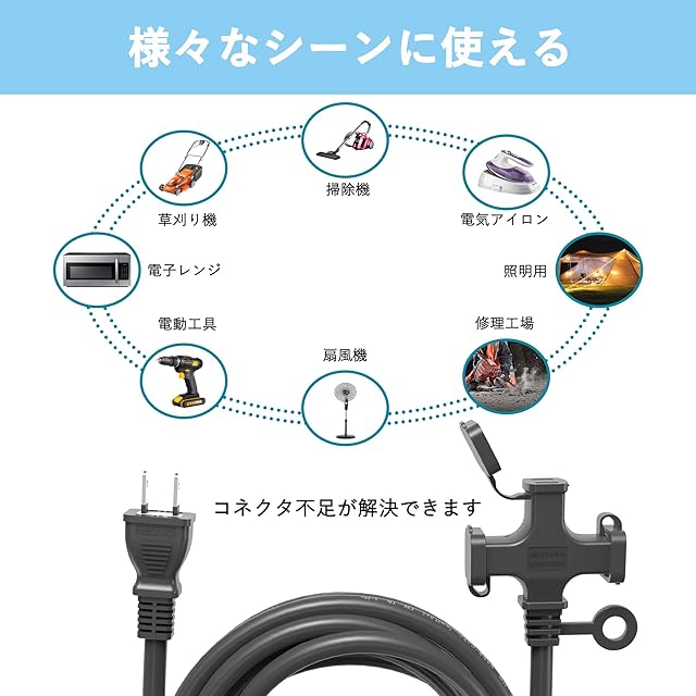■【丈夫で便利】タップ、イルミネーションや屋外配線や電動工具などに使える便利な3分配延長コード。